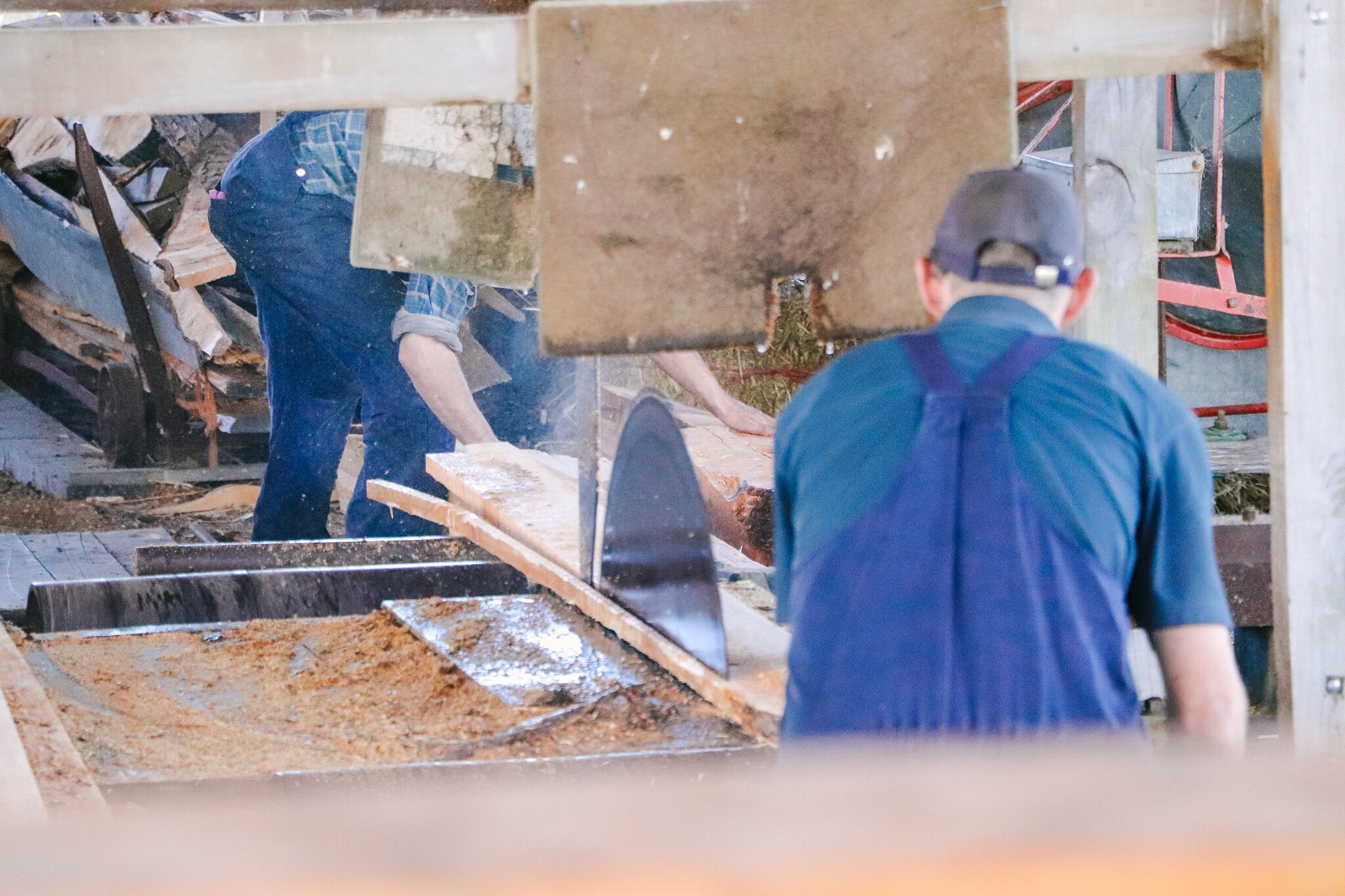 The circular cutting saws are belt driven, powered by the steam engine with logs levered onto a dolley that the Sawyer uses to guide the timber through the cutting sawblade, with the resultant sawdust carried away by a linkage pulley. It’s quite an experience to watch skilled Sawyers handling and positioning very large pieces of timber wood through the sawmill to the final cutting process.